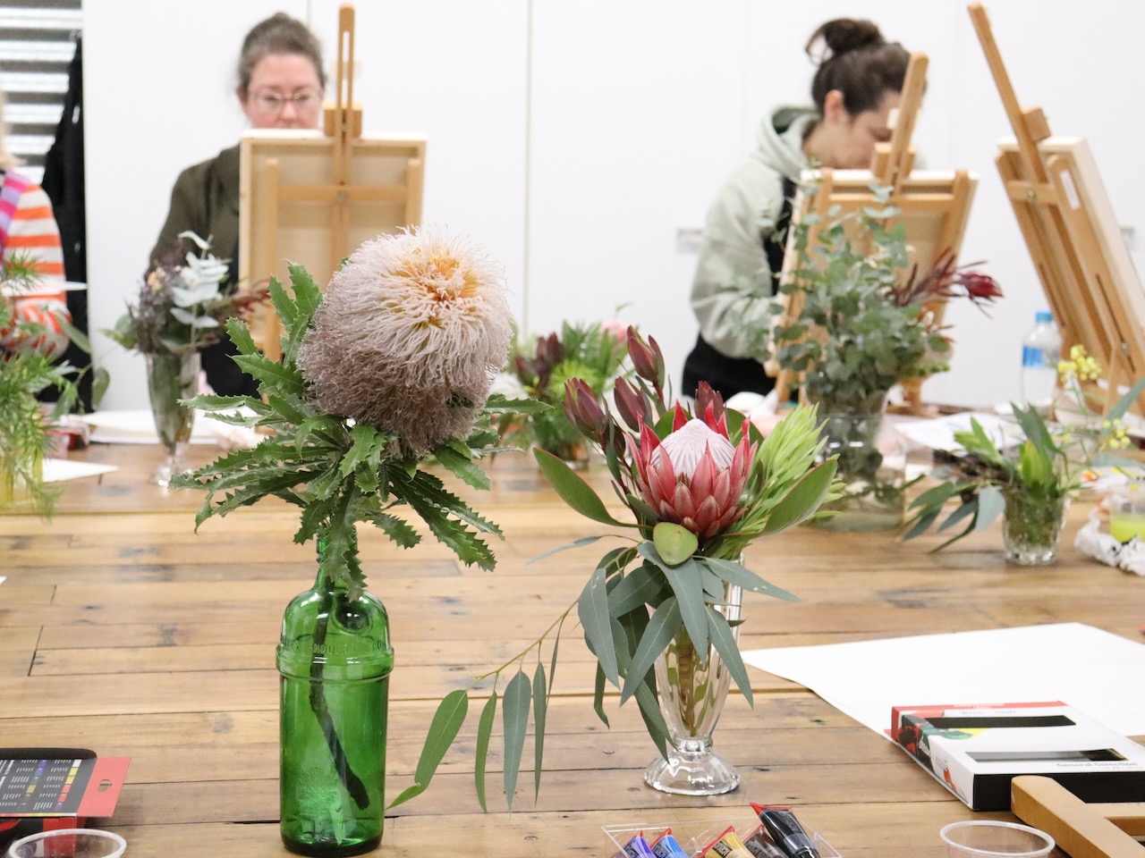 Join Emily in an all-day Botanical Still Life Workshop in the heart of the Macedon Ranges. This is not a paint-and-sip type workshop; you will be learning the technical skills of sketching and composing an acrylic painting including how to mix colours and layer them together with different brush techniques to achieve depth and movement so your painting doesn’t fall flat or look cartoonish.