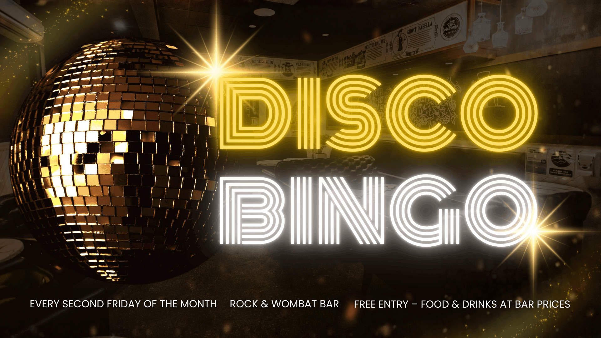 Join us in the Rock & Wombat Bar for Dolly’s Disco Bingo — a FREE event packed with laughs, music, and all your favourite disco hits!