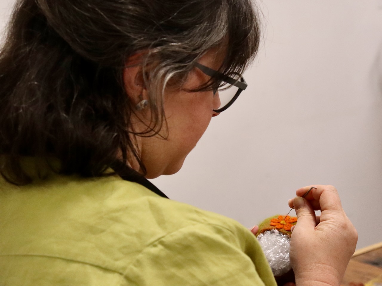 In this three hour introduction to Wet and Needle Felting Workshop, you will learn the basics of wet felting and then take it a step further to felt on a resist. Then you will be guided in needle-felting the finishing details onto your pod, like the cute flower on this vessel.