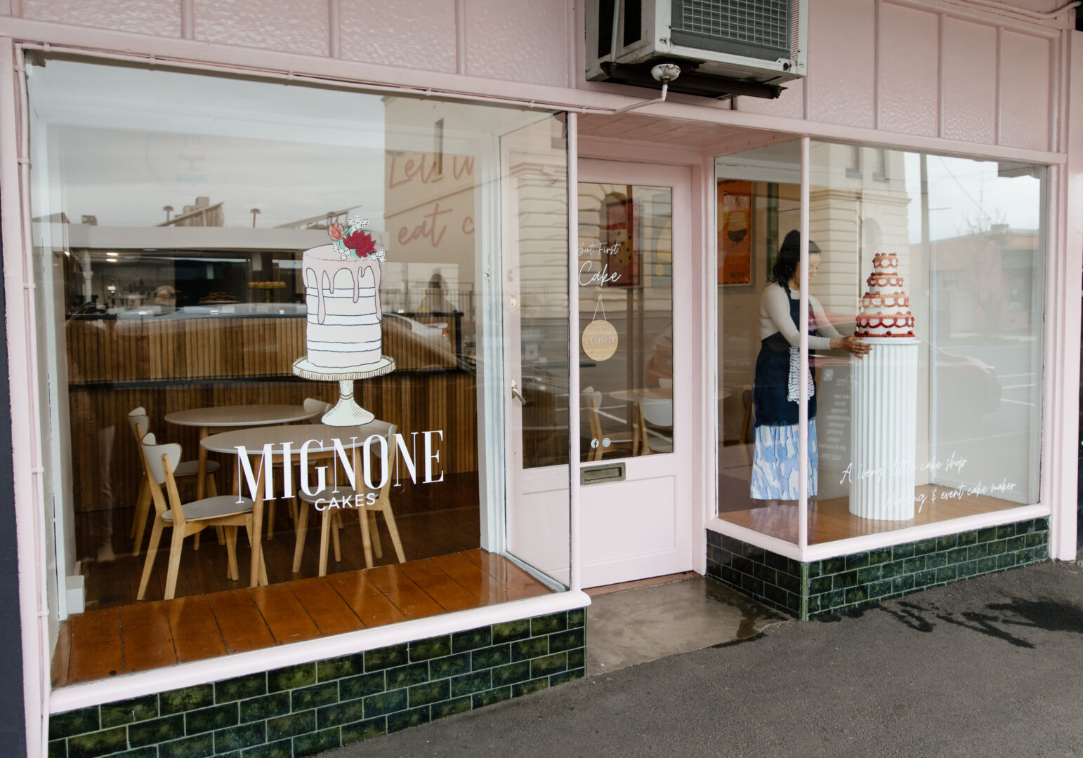 Mignone Cakes is a cute little cake shop that is small in size but big in fun! Located on busy High Street in Kyneton, it is just an hour’s drive from Melbourne and 40 minutes from Bendigo. Fitted out with vintage style display cakes, disco balls, original retro cake prints, mismatched cake stands found at op shops over the years and 70s music playing on repeat, Mignone Cakes is a place for young and old alike.